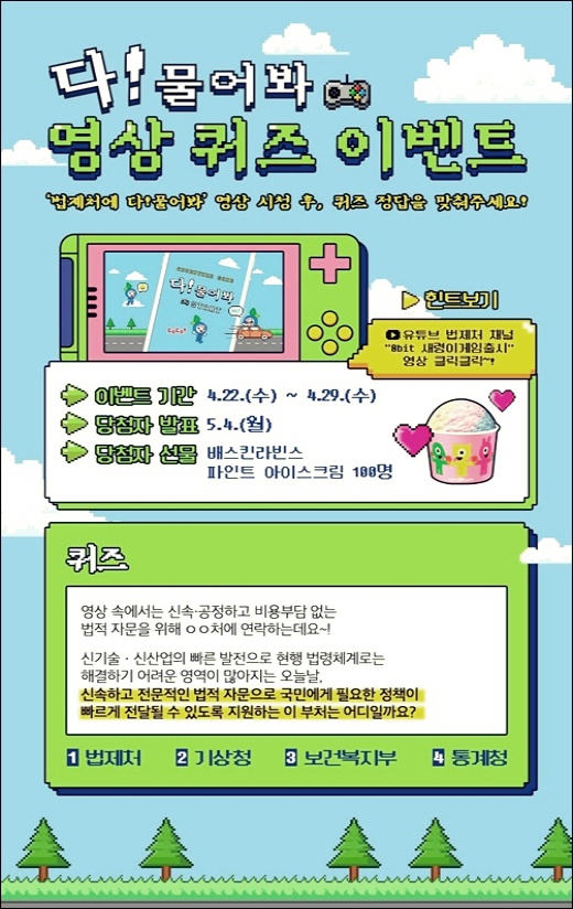 [경품 이벤트] 법제처에 다! 물어봐 영상 퀴즈 이벤트 "귀여운 게임으로 법제처가 하는 일을 알아볼까요?🎮" 유튜브 법제처 채널 "8bit 새령이 게임 출시" 영상 속 힌트를 보고 퀴즈의 정답을 맞춰주세요. 정답을..