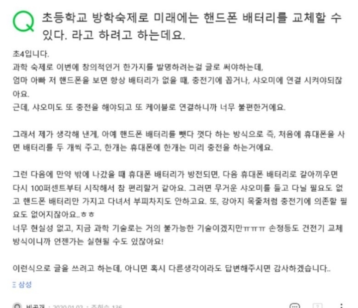 '초등학교 방학숙제로 미래에는 핸드폰 배터리를 교체할 수 있다'