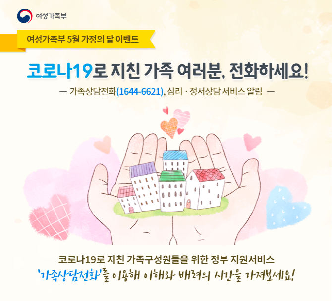 여성가족부에서 이벤트가 진행중인데요. 가족상담전화를 이용해 이해와 배려의 시간을 가져보다는 취지에서 시작된 이벤트인 것 같습니다. 코로나19 바이러스로 지친 가족구성원들을 위한 정부 지원서비스!! 가족상담전화 1644-6621 심리 정서상담 서비스 알림.