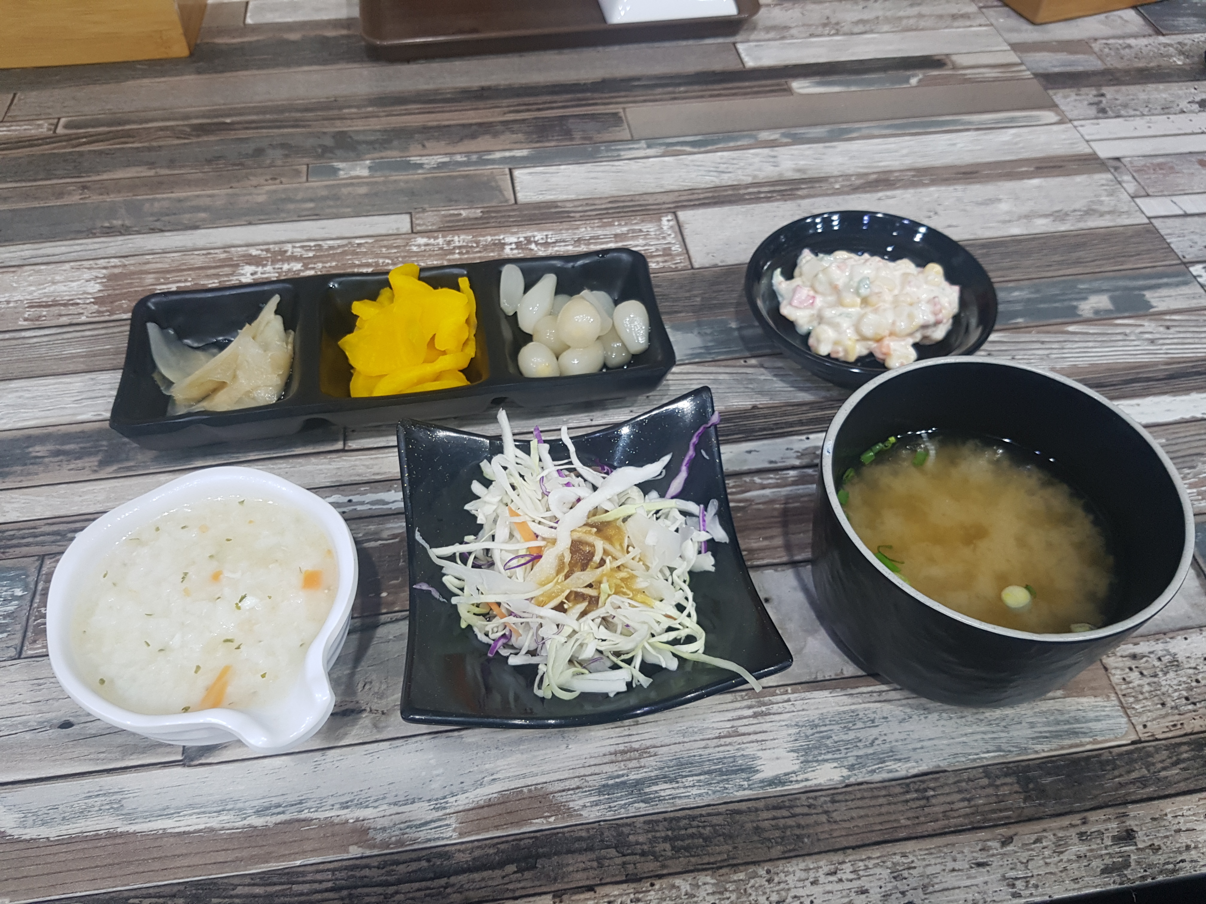 기본찬은 야채죽, 락교, 샐러드, 미소시루 등이 나와요.
