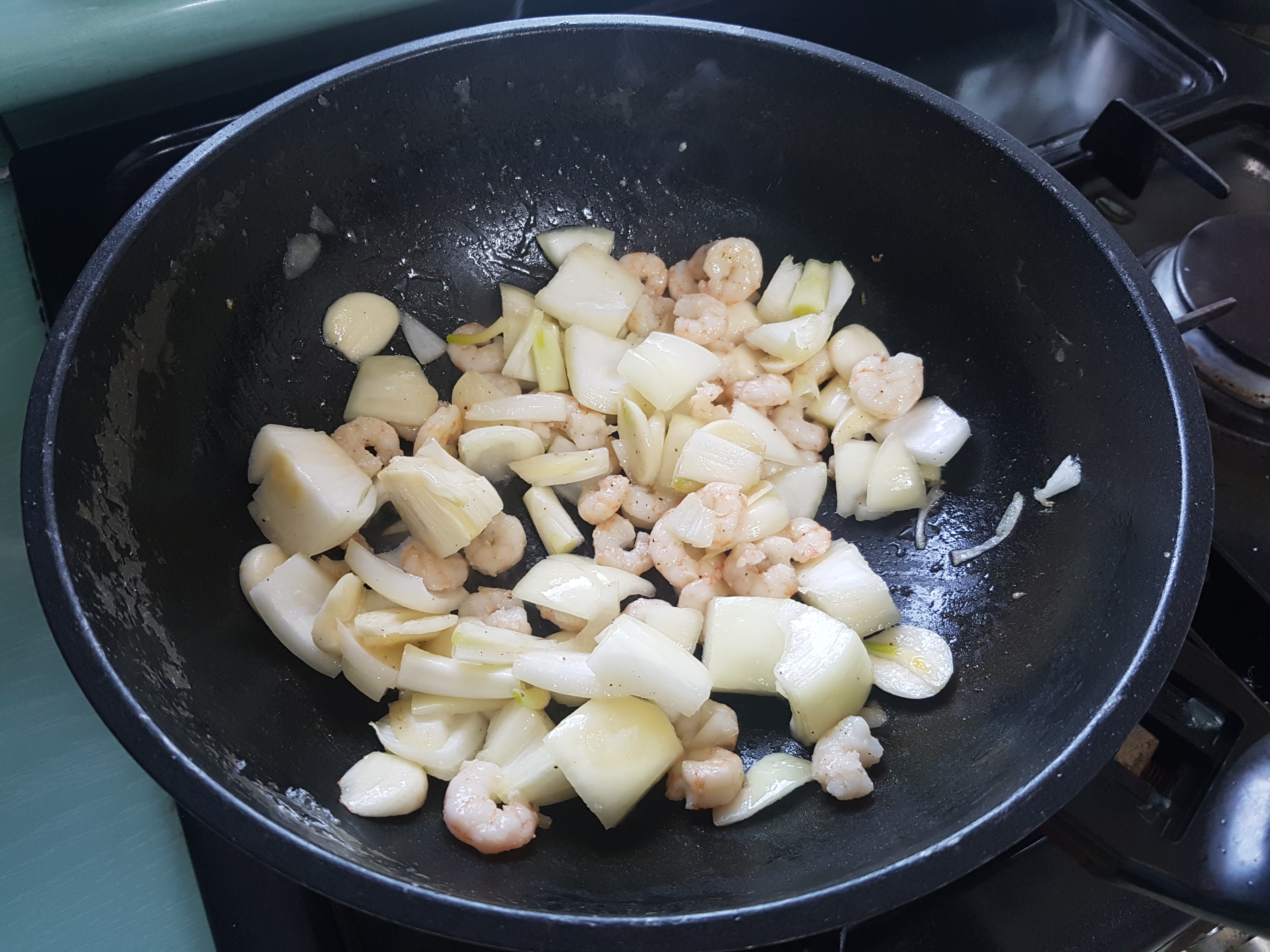 양파, 마늘, 새우를 볶아주었습니다.